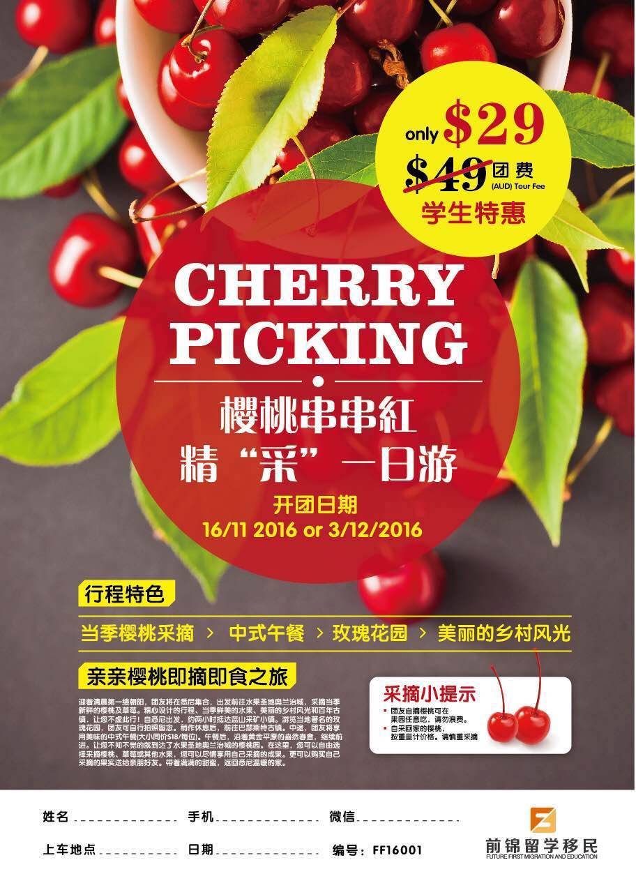 现在前锦俱乐部给同学们送福利啦!旅行团市场价49澳币的团费,通过我们报名只要29澳币。50张樱桃节票,限时抢购啦!!!