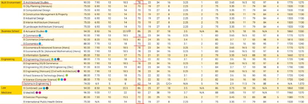 下面这个是2020年和2021年,新南各个专业对应的高考分数百分比的录取要求,如果图片太小大家看不清的话也没关系,F酱就以几个比较热门的专业为例摘录出来: