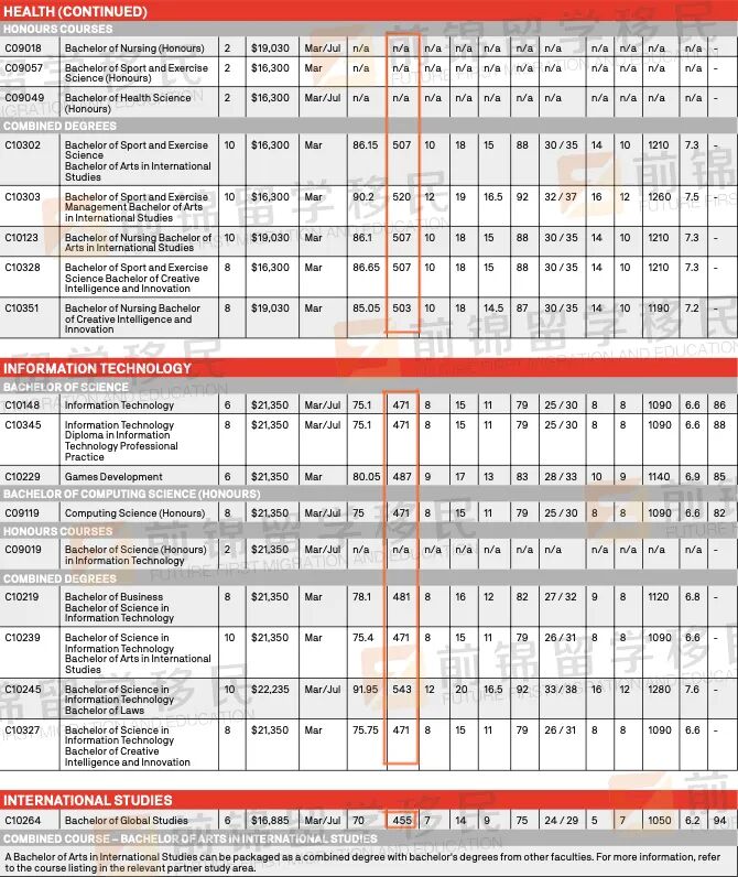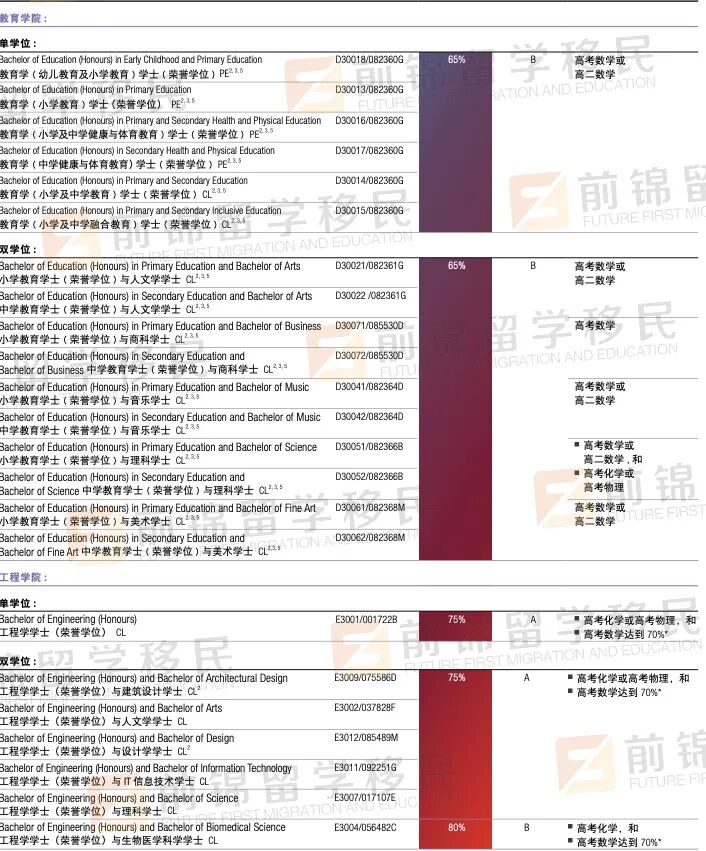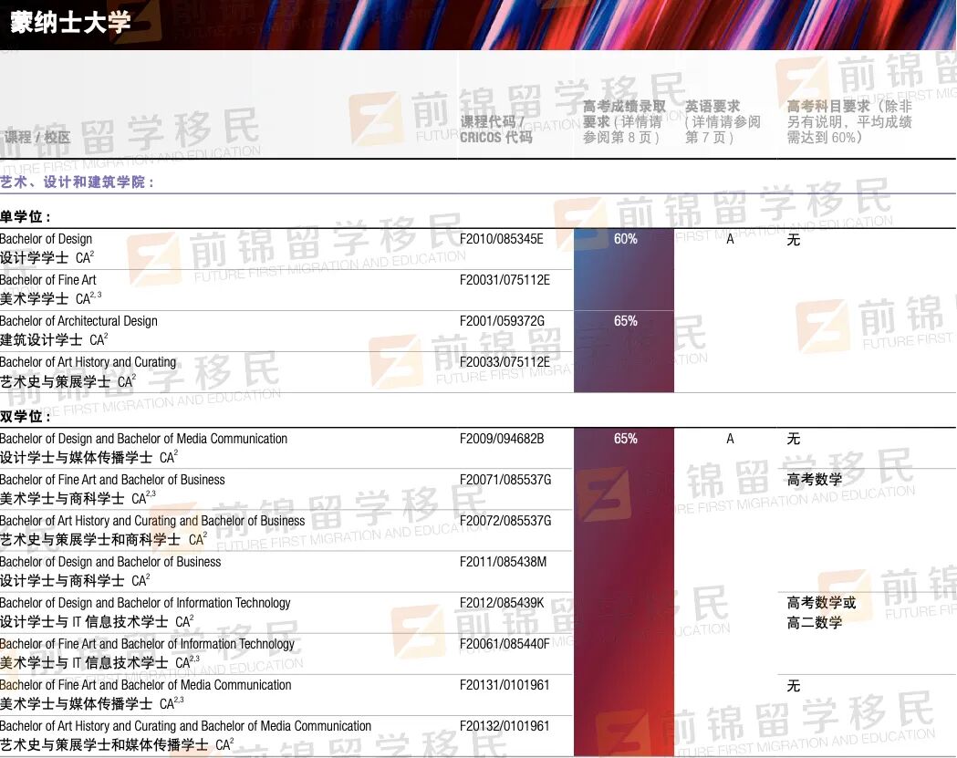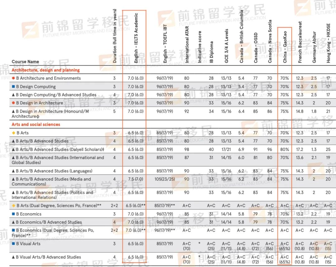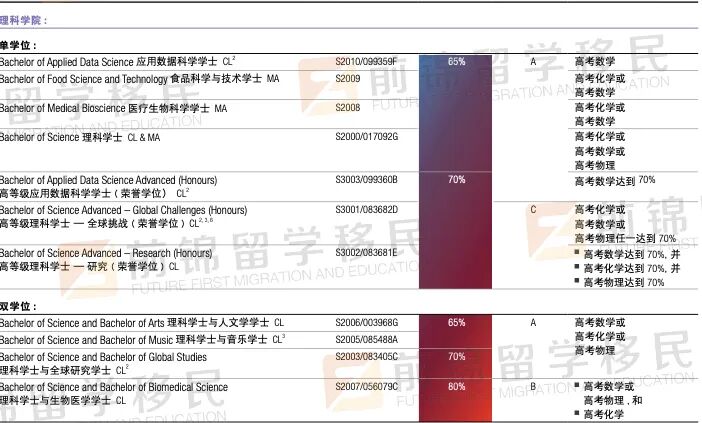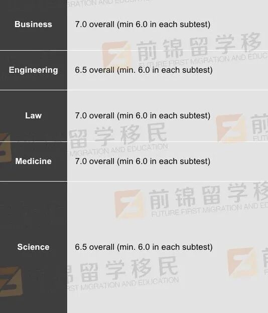 今年高考的同学看这里!澳洲名校热门专业的高考录取标准,你满足哪一个? 今年参加高考的同学们已经拿到成绩了吧,一直以来大家形容高考都是千军万马过独木桥🧑🎓 实在是因为祖国人口基数太大,导致竞争激烈。如果你的成绩不能让你上国内的重本大学,其实出国留学也是一个很棒的选择哦!🤔 以澳洲为例,全澳不乏世界排名领先的名校,并且相比较于国内,澳洲的名校在招生上更加灵活,除了看重成绩外,同学们也可以通过预科、国际大一等方式进入名校。 下面F酱就给大家简单介绍一下澳洲一些名牌大学,对高考分数的要求。 The University of Sydney 悉尼大学 🏆 QS世界排名:40 📝 总体要求: 高考分数;65%-80% 英文成绩;总分6.5,单科不低于6.0 热门专业要求 建筑、设计学院 高考分数:70%-75% | 英文要求:总分7.0,单科不低于6.0 文科、社会科学学院 高考分数:65%-80% | 英文要求:总分6.5,单科不低于6.0 商科学院 高考分数:75%-80% | 英文要求:总分7.0,单科不低于6.0 教育、社工学院 高考分数:65%-70% | 英文要求:总分6.5,单科不低于6.0 工程、计算机科学学院 高考分数:70%-80% | 英文要求:总分6.5,单科不低于6.0 法律、医药和健康学院 高考分数:70%-75% | 英文要求:总分6.5,单科不低于6.0 音乐、科学学院 高考分数:65%-80% | 英文要求:总分6.5,单科不低于6.0 The University of NSW 新南威尔士大学 🏆 QS世界排名:44 📝 总体要求: 高考分数;70%-90% 英文成绩;总分6.5,单科不低于6.0 Diploma(国际大一)要求:62% * 该课程可直接衔接本科大二,达不到以下本科直入要求的同学可以通过该国际大一课程进入本科 热门专业要求 艺术、设计学院 高考分数:70% | 英文要求:总分6.5,单科不低于6.0 文科、社会科学学院 高考分数:70%-80% | 英文要求:总分6.5,单科不低于6.0 特例:Bachelor of Education 英文要求:总分7.0,写作、阅读不低于6.5,听力、口语不低于7.5 建筑学院 高考分数:70%-78% | 英文要求:总分7.0,单科不低于6.0 商科学院 高考分数:75%-86% | 英文要求:总分7.0,单科不低于6.0 工程学院 高考分数:75%-80% | 英文要求:总分6.5,单科不低于6.0 法学院 高考分数:86% | 英文要求:总分7.0,单科不低于6.0 医学院 高考分数:70%-90% | 英文要求:总分7.0,单科不低于6.0 科学院 高考分数:70%-88% | 英文要求:总分6.5,单科不低于6.0 Write c The University of Technology Sydney 悉尼科技大学 🏆 QS世界排名:133 📝 总体要求: 高考分数;61%-75%(按总分750) 英文成绩;总分6.5,单科不低于6.0 Diploma(国际大一)要求:68.5%(高三成绩) * 该课程可直接衔接本科大二,达不到以下本科直入要求的同学可以通过该国际大一课程进入本科 热门专业要求 商科学院 高考分数:471-543 | 英文要求:总分6.5,单科不低于6.0 交流学院 高考分数:455-543 | 英文要求:总分6.5,单科不低于6.0 设计、建筑学院 高考分数:455-516 | 英文要求:总分6.5,单科不低于6.0 教育学院 高考分数:455| 英文要求:总分6.5,单科不低于6.0 工程学院 高考分数:471-543 | 英文要求:总分6.5,单科不低于6.0 健康学院 高考分数:455-520 | 英文要求:总分6.5,单科不低于6.0 信息科技学院 高考分数:471-543 | 英文要求:总分6.5,单科不低于6.0 国际学院 高考分数:455 | 英文要求:总分6.5,单科不低于6.0 法学院 高考分数:543-566 | 英文要求:总分6.5,单科不低于6.0 科学院 高考分数:461-566| 英文要求:总分6.5,单科不低于6.0 Monash University 蒙纳士大学 🏆 QS世界排名:55 📝 总体要求: 高考分数;60%-80% 英文成绩;总分6.5,单科不低于6.0 Diploma(国际大一)要求:80%(高三成绩)/ 60%-65%(高考成绩) * 该课程可直接衔接本科大二,达不到以下本科直入要求的同学可以通过该国际大一课程进入本科 热门专业要求 艺术、设计、建筑学院 高考分数:60%-65% | 英文要求:总分6.5,单科不低于6.0 人文社科学院 高考分数:60%-70% | 英文要求:总分6.5,单科不低于6.0 商学院 高考分数:60%-65% | 英文要求:总分6.5,单科不低于6.0 教育学院 高考分数:65% | 英文要求:总分6.5,听力阅读不低于6.5,写作口语不低于6.0 工程学院 高考分数:75%-80% | 英文要求:总分6.5,单科不低于6.0 IT信息技术学院 高考分数:65% | 英文要求:总分6.5,单科不低于6.0 法学院 高考分数:80% | 英文要求:总分7.0,单科不低于6.5 医学、护理与健康科学学院 高考分数:60%-80% | 英文要求:总分6.5,单科不低于6.0 * 部分专业英语要求略有不同 理科学院 高考分数:65%-80% | 英文要求:总分6.5,单科不低于6.0 * 部分专业英语要求略有不同 更多澳洲留学移民的问题, 欢迎随时扫码咨询! 移民留学,找前锦就对啦! 👇🏼👇🏼👇🏼