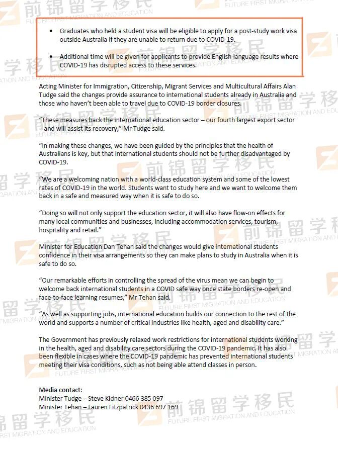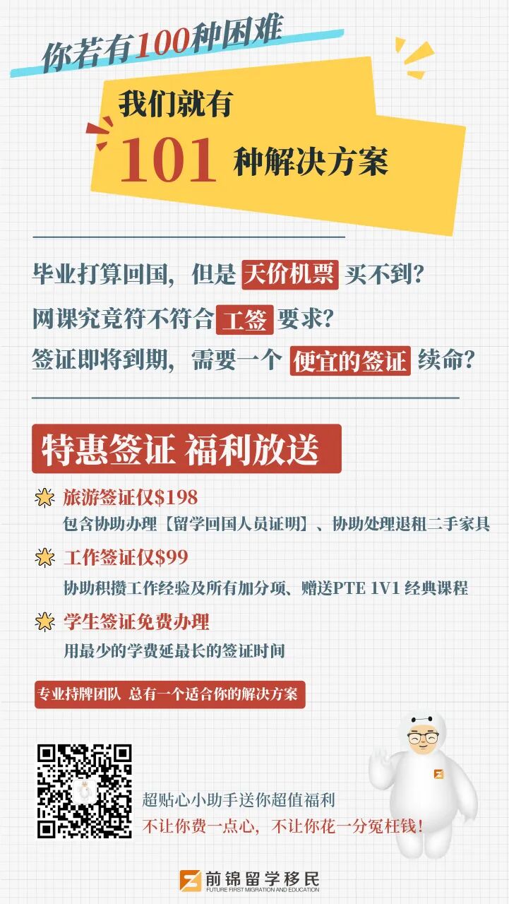 免费续学签更多细节出炉!学生签证条款改变,部分同学可以工作超过40小时! 刚刚澳洲移民局公布了关于免掉受疫情影响的学生们续学签费用的更多细节,同时也公布了一些学生签证的条款变更,以及485工签的一些变化。 01续学生签证免费 适用人群: 在2020年2月1日或之后,持有学生签证,且因为疫情而无法按时完成学业的同学。该学生签证持有人若有副申请人或监护人,满足条件的话也适用。 条件: 证明是受疫情的影响而无法按时完成学业。需要学校填一份1545表格(1545 Form-COVID-19 Impacted Students),在递交续签申请时,附上这份表格就可以了。 需要表格的同学可以联系F酱,也可以自行在网上下载。 生效时间: 2020年8月5日midnight。 符合这个要求,但是已经递交过续签申请的同学,是不能够申请退款的。只有在上述时间新递交的签证才可以申请到费用豁免。 02学生签证条款变更 🔸 被学校approve了defer的同学,或上网课的同学,现在是满足学生签证条款的 🔸 以下同学可以豁免每两周40小时的工作时间限制: – 受雇于卫生部门,参加了与卫生相关的课程(例如护理或医学),并由卫生官员指导以协助对抗COVID‑19 – 受雇于认可提供者或英联邦资助的老年护理机构 – 被注册的国家残疾保险计划提供商雇用 03毕业生工签变更 🔸 因疫情而导致的上网课的时间,可以被纳入485工签2年的学习时间之内,这个变更已经生效。 🔸 受疫情影响在境外,并且满足其他要求的毕业生,也能够申请485工签,这个变更目前还没有生效。 更多澳洲留学移民的问题, 欢迎随时扫码咨询! 移民留学,找前锦就对啦! 👇🏼👇🏼👇🏼